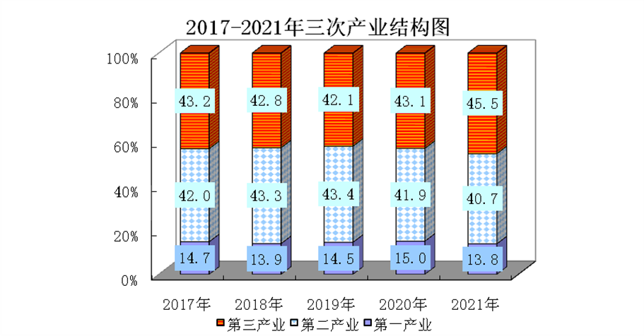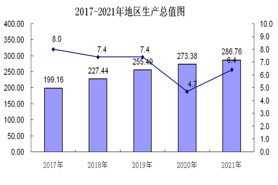 初步核算,2021年地区生产总值实现286.76亿元,增长6.4%。其中:第一产业增加值39.54亿元,增长4.4%;第二产业增加值116.84亿元,增长7.3%;第三产业增加值130.38亿元,增长6.4%。三次产业增加值占地区生产总值的比重,第一产业为13.8%,第二产业为40.7%,第三产业为45.5%。全年人均地区生产总值103150元,增长6.4%。
