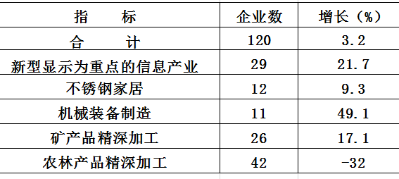 全年规模以上工业企业实现利润总额16.02亿元,下降4.5%;其中股份制企业实现利润总额14.9亿元,下降6.3%,外商及港澳台商投资企业实现利润总额0.6亿元,增长50%。     全年规模以上工业中,以新型显示为重点的信息产业、矿产品精深加工、农林产品精深加工、不锈钢家居及机械装备制造“1+4”先进制造业产值现价增长3.2%,对规模以上工业的贡献率高达64%。     建筑业企业及产值双破百,全年全县新增资质以上建筑业企业13家,企业总数突破百家,达105家;总专包建筑业企业总产值首次突破百亿,达114.95亿元,增长21.3%。全社会建筑业实现增加值45.18亿元,增长7%。 2021年规模以上工业重点产业情况
