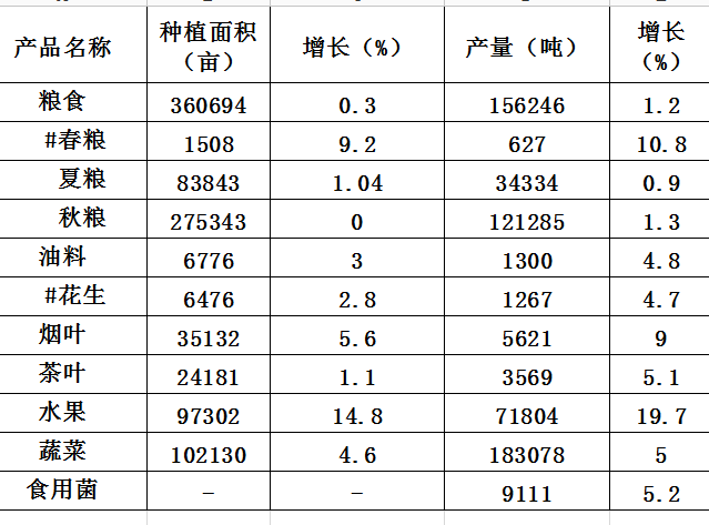 全年农林牧渔业总产值71.63亿元,增长4.9%。其中,农业产值26.96亿元,增长5.1%;林业产值8.72亿元,增长1%;牧业产值32.43亿元,增长5.9%;渔业产值2.03亿元,增长2.5%;农林牧渔服务业产值1.5亿元,增长5.1%。农业综合生产能力平稳,全县粮食播种面积36.07万亩,增长0.3%,全年粮食产量15.62万吨,增长1.2%;蔬菜产量18.31万吨,增长5%;茶叶产量3569吨,增长5.1%;水果产量7.2万吨,增长19.7%;食用菌产量9111吨,增长5.2%。